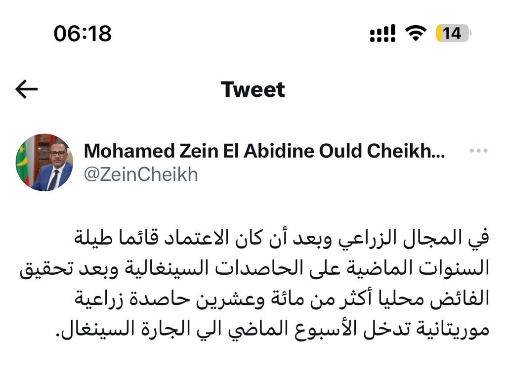 من حساب رئيس اتحاد ارباب العمل الموريتانيين، محمد زين العابدين ولد الشيخ أحمد، على تويتر