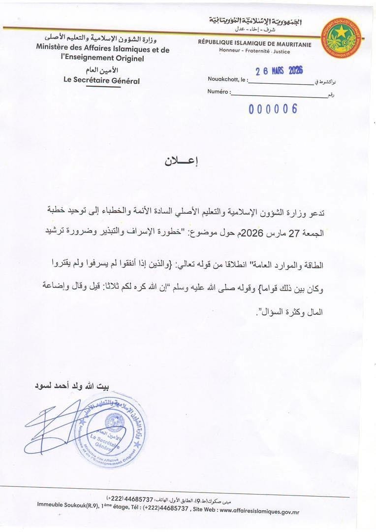 دعت وزارة الشؤون الإسلامية والتعليم الأصلي الأئمة والخطباء إلى توحيد خطبة الجمعة غدا حول "خطورة الإسراف والتبذير وضرورة ترشيد الطاقة والموارد العامة".