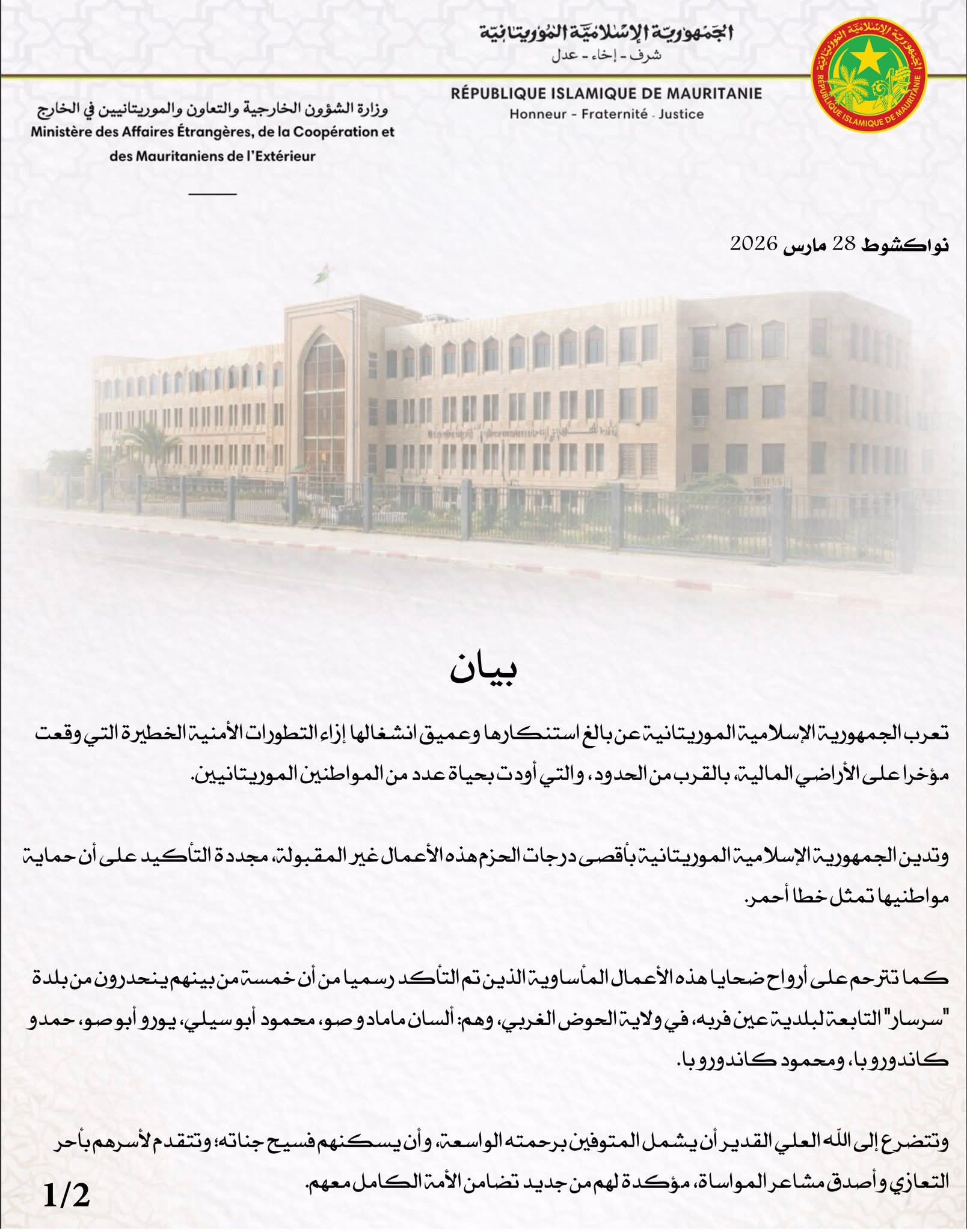 أعربت الجمهورية الإسلامية الموريتانية عن بالغ استنكارها وعميق انشغالها إزاء التطورات الأمنية الخطيرة التي شهدتها الأراضي المالية مؤخرًا، قرب الحدود، والتي أسفرت عن مقتل عدد من المواطنين الموريتانيين.