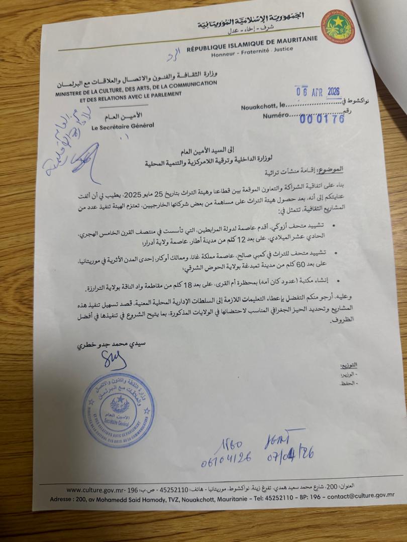 توجهت خلال عطلة هذا الأسبوع. بعثة من خبراء هيئة التراث الموريتاني برئاسة رئيس الهيئة الأستاذ محمد الشيخ ولد سيد محمد. الى ولايات. تكانت. وآدرار. والحوضين الشرقي والغربي لمعاينة تقدم الأشغال الجاربة في منشأة صون تراث بولكر بن عامر والتحضير لاطلاق. الأشغال في منشأة قرية التراث في مقاطعة تشيت تزامنا مع النسخة الخامسة عشر 15 من مهرجان مدائن التراث المنظمة هذا العام في تشيت نوفمبر- دجمبر2026 موازاة مع عمل فرق هيئة التراث على انجاز بربك التراث. والتنوع الثقافي في أنواكشوط ويسمل برنامج البعثة اختيار موقع لتشييد متحف. آزوكى أول عاصمة لدولة المرابطين22كلومترا من أطار. عاثمة ولابة آدرارومتحف الآثار والملثمين في أوداغوست. عاصمة ممالك الملثمين منذ ما قبل الميلاد بولابة الحرض الغربي40 كلم من مقاطعة تا مشكط