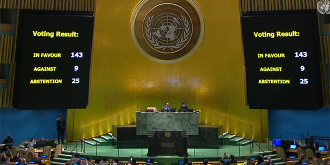 وصوتت لصالح مشروع القرار 143 دولة، وعارضته 8 دول وكيان الاحتلال الإسرائيلي، فيما امتنعت 25 عن التصويت.