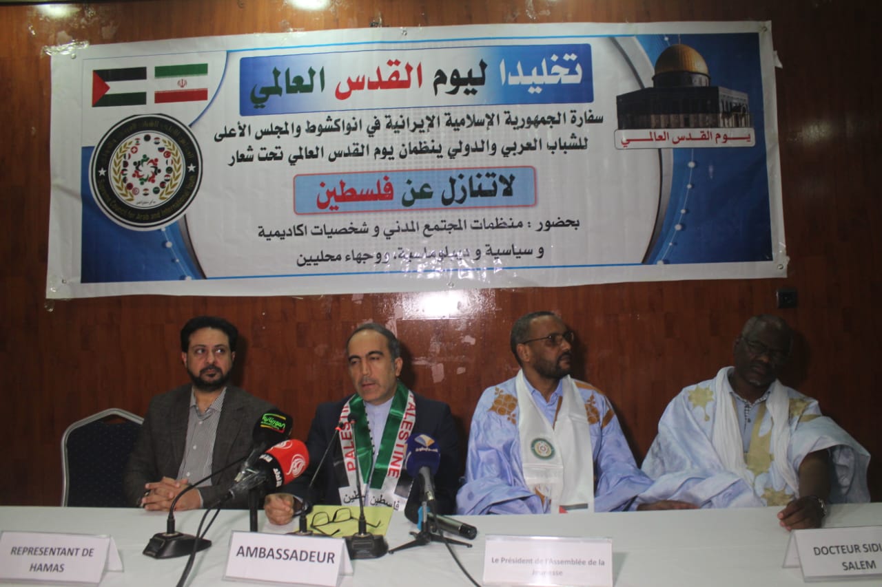بحضور مشايخ وعلماء ووزراء سابقين وشخصيات سياسية وحزبية ونشطاء شباب خلد المجلس الاعلى للشباب العربي و الدولي بالتعاون مع سفارة الجمهورية الاسلامية الايرانية في نواكشوط بفندق وصال وسط العاصمة الخميس 03 ابريل 2024 الموافق ل 25 رمضان ذكرى يوم القدس العالمي تحت شعار (( لا تنازل عن فلسطين))،