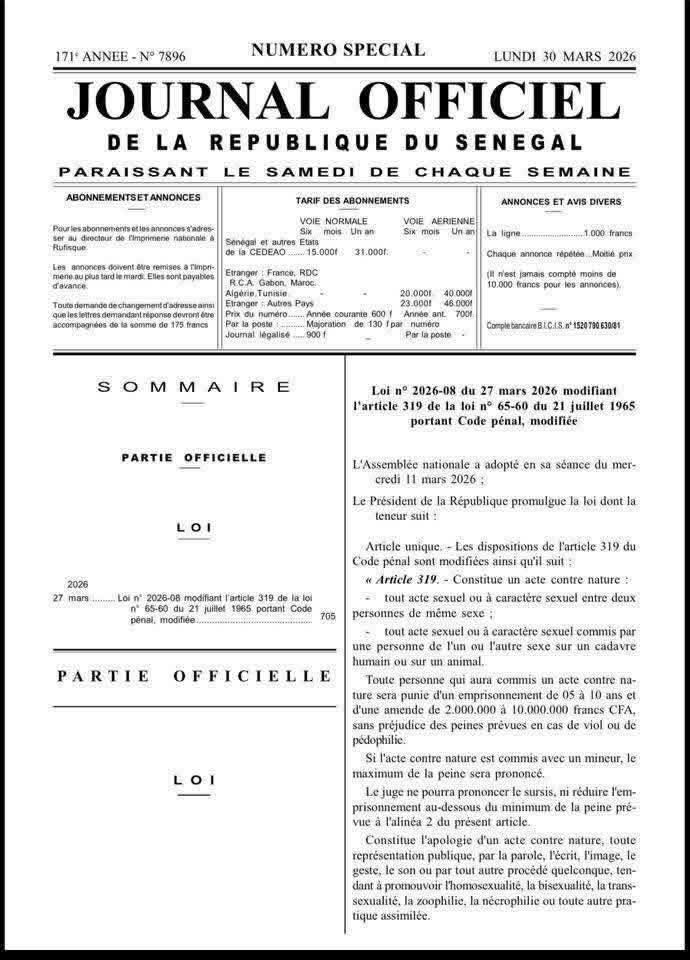 وكان البرلمان السنغالي صادق بأغلبية ساحقة يوم الأربعاء (11 مارس 2026م) مشروع القانون رقم 05/2026 الذي يهدف إلى تشديد عقوبات المثلية الجنسية عن طريق تعديل المادة ال 319 من القانون الجنائي بشأن الشذوذ الجنسي .