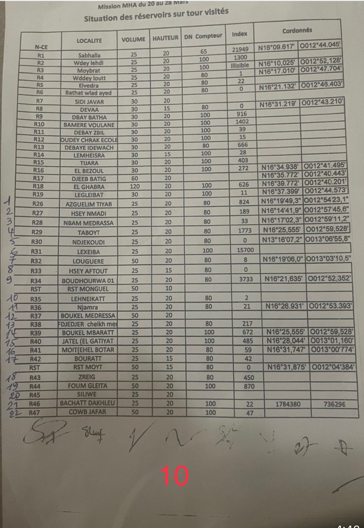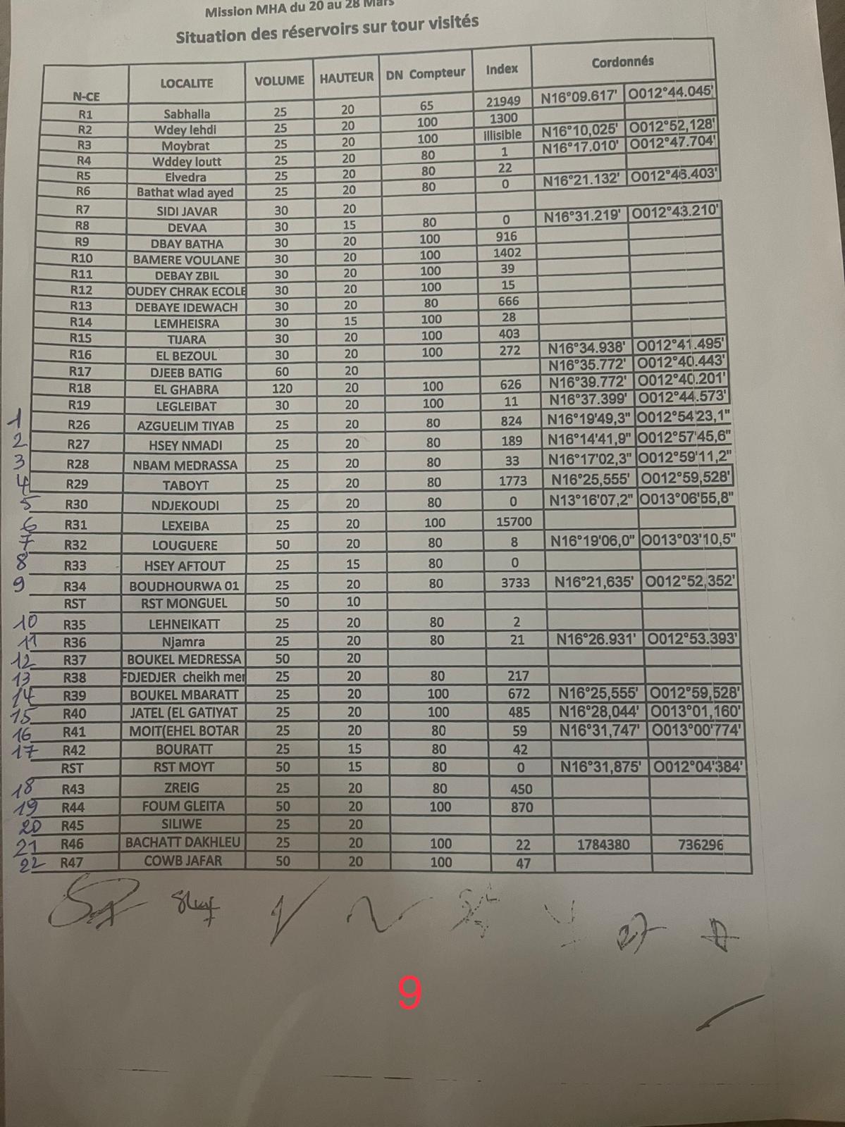بحسب محضر الاستلام الموقع بتاريخ 2 نوفمبر 2020، فإن مجموع الحنفيات العمومية التي تم إنجازها في المكونة (أ) :271 وفي المكونة (ب) : 81، وهو ما يعني ضياع 50 حنفية (انظر الوثيقة3)، لكن من الواضح أيضا أن عدد الحنفيات العمومية المستلمة حسب محضر الاستلام لم يكن صحيحًا، لأن بعثة مشتركة بين وزارة المياه والشركة الوطنية للمياه أعدت تقريرا يوم 28 مارس 2021، أي بعد أربعة أشهر من الاستلام أثناء جولة استغرقت ثمانية أيام تهدف لإحصاء المنجزات من أجل البدء باستخدامها، أظهرت أن عدد الحنفيات الفعلية الموجودة على أرض الواقع لا يتجاوز 319 (انظر الوثيقة9)، وهو ما يدلل على وجود تواطئ مكتب الدراسات المكلف بالرقابة وعدم مصداقية لجنة الاستلام، بعد تجاهلهم لعدم انجاز 83 حنفية (أي نسبة 20.64%) .