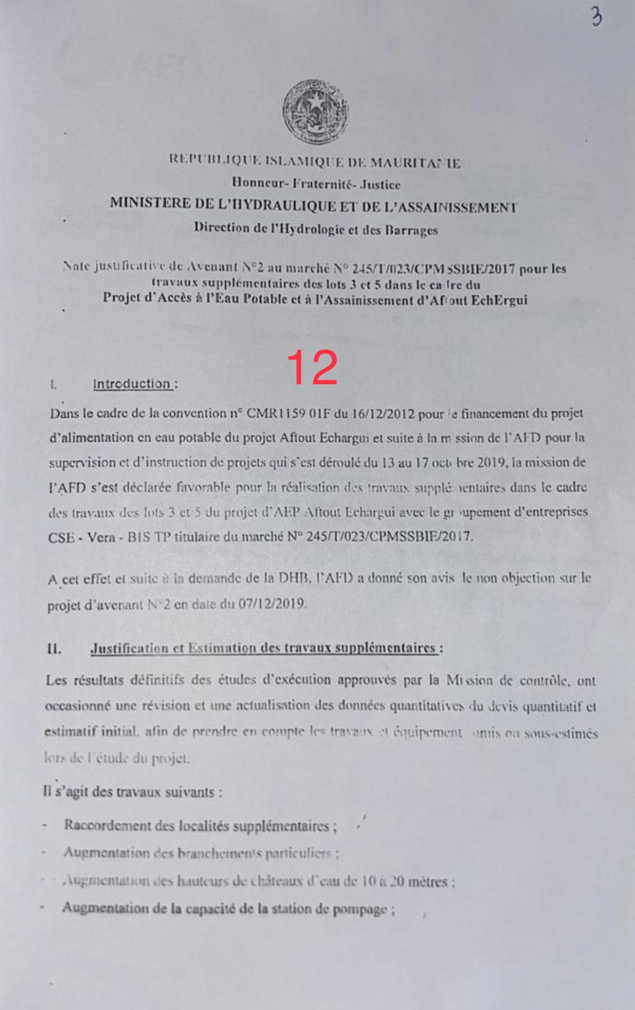 بالرغم من كل ما اطلعتم عليه من نقصان فج في أهم مكونات المشروع، فقد تم منح مبلغ إضافي للشركة المنفذة من خلال ملحق بقيمة: 699.329.334 أوقية قديمة مع إعفاء ضريبي بلغ (209.911.523 أوقية) (الوثيقة 11) ، فبل انتهاء الأشغال بأشهر، وتم تبرير العقد الجديد ب :
