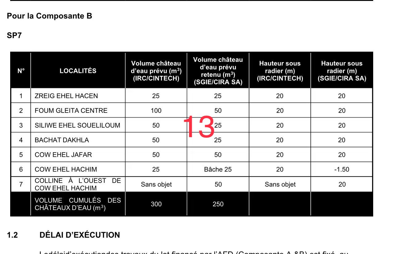 يبلغ عدد الأبراج 19 برجا بالإضافة إلى 1 خزان RST في المكونة (أ) و 6 أبراج بالإضافة إلى 1 خزان RST في المكونة (ب) انظر (الوثيقة)، لكن حسب محضر الاستلام (الوثيقة) لم ينجز سوى 18 برجا في المكونة (أ) و 6 ابراج مائية في (ب )، وهو ما يعني ضياع برج واحد فقط، أما بالنسبة لبعثة وزارة المياه التي أحصت الأبراج بعد أربعة اشهر فلا يوجد سوى 17 في المكونة (أ) و5 في المكونة (ب)، و هو ما يعني عدم انجاز ثلاثة أبراج (12% من مجموع الأبراج المبرمجة)، وهو ما يؤكد عدم مصداقية لجنة الاستلام (الوثيقة 10).