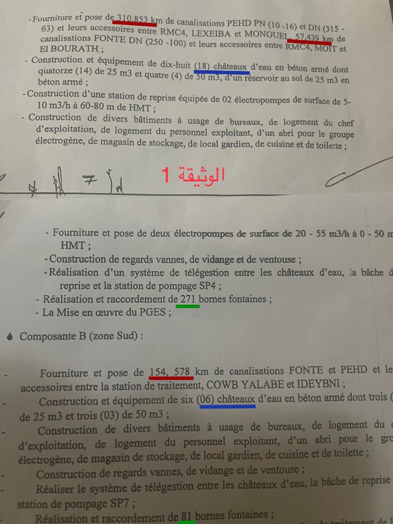 • و جزء ثان: يسعى إلى تزويد القرى المستفيدة، انطلاقا من الخزان الضخم في شلخت التياب، عبر شبكة من الأنابيب تُزود مئات الحنفيات العمومية، وذلك أساسا من خلال صفقتين كبيرتين فاز بهما تحالف ( groupement: CSE-VAERA-BIS TP) التابع لرئيس الاتحاد الوطني لأرباب العمل الموريتانيين، السيد زين العابدين، تبلغ الأولى (4.189.204.808 أوقية)، إضافة إلى إعفاء ضريبي بمبلغ (953.344.381 أوقية)، وهي الصفقة ( ( LOT 2-2 ) ، أما الثانية فتعرف بصفقة (AFD) نسبة إلى الوكالة الفرنسية للتنمية التي وفرت التمويل، وبلغت (5.828.639.234 أوقية قديمة) بالإضافة إلى إعفاء ضربي بقيمة : (1.785.299.365) أوقية قديمة