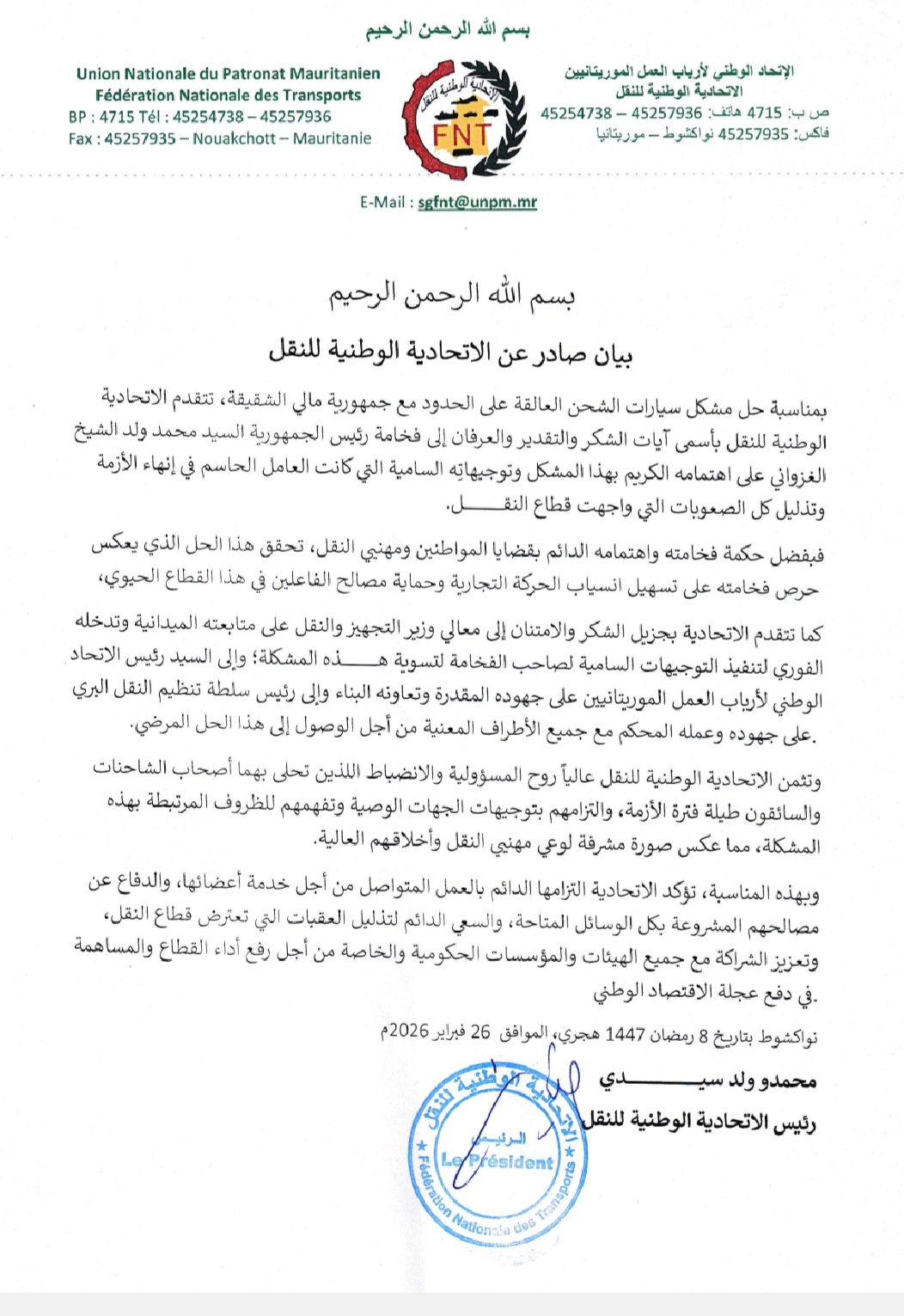 تقدم رئيس الاتحادية الوطنية للنقل السيد محمدو ولد سيدي باسمى آيات الشكر،والتقدير لرئيس الجمهورية السيد محمد ولد الشيخ الغزواني لاهتمامه الكبير بازمة الشاحنات ابموريتانية العالقة بجمهورية و ما بذله من دبلوماسية هادئة في،سبيل حل هذا المشكل وانهاء هذه الازمة وهي الازمة التي لولا تعليماته السامية وتوجيهاته في هذا الصدد لما وجدت الحل ولما وجد قطاع النقل الوطنس كل ما من شأنه تذليل كل الصعوبات ..